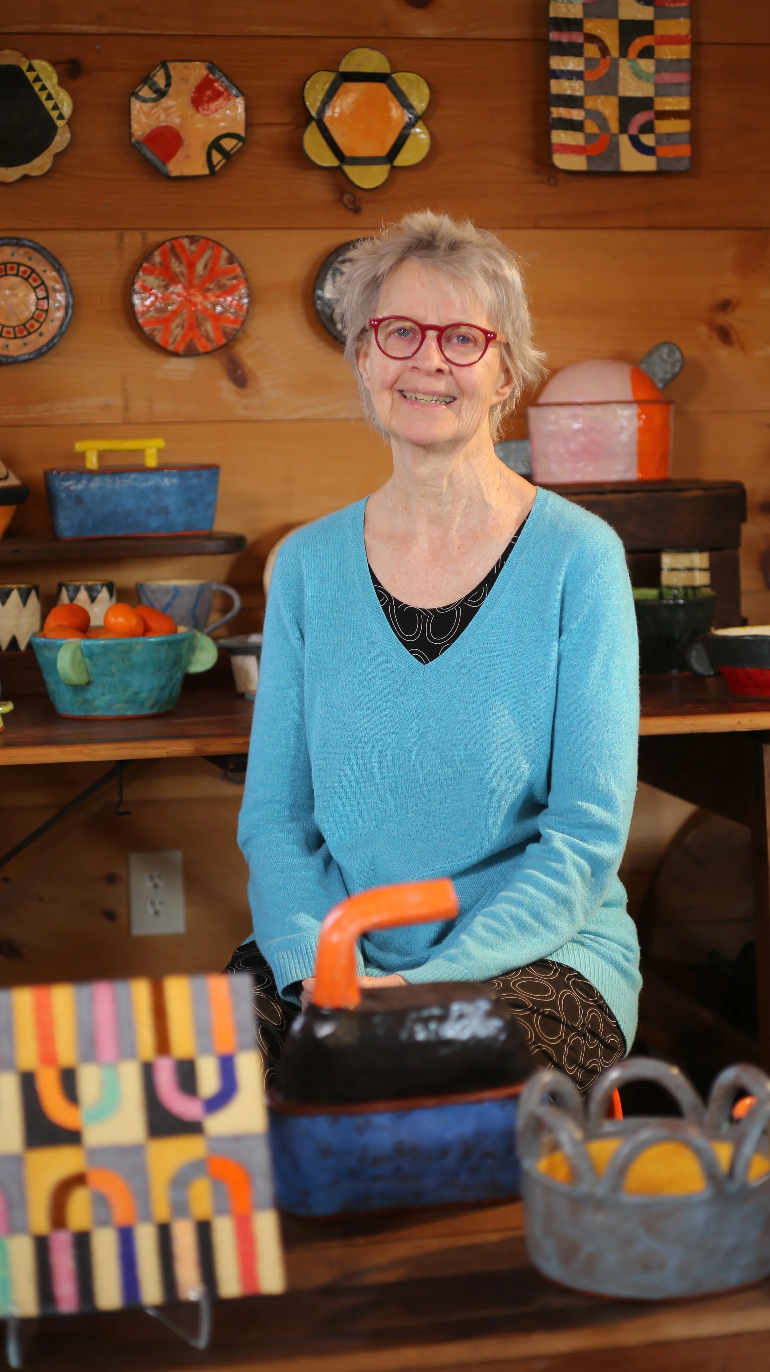 Geometry seems to be so much a part of my thinking and visualizing in the studio. A dictionary would tell us that geometry is the part of math that studies the sizes, shapes, positions, and dimensions of things. When I am questioning the surface of a pot, I imagine myself as an ant crawling over the pot. Such an intimate vantage point! What direction would I be inclined toward? What trail would my journey make over the topography of the form's surface? Would I walk a straight dividing line, or make a loop? How does the form guide my wandering? What patterns would punctuate the surface activity? How could this be explored through color? What if I were two or three ants? I looked up geometry terms to widen my approach and came up with an infusion of ideas that will fuel me for some time to come. Words like "aquifer", "canal", "crater", "atlas", "alluvial fan", "confluence", and that is just the beginning of the alphabet! It became clear that my daily dive into making small hanging plates was truly an "atlas": a collection of maps of my daily journeys with plates. A bowl may be seen to have a "crater" interior, or a "ravine", or an "oasis". A series of curves may become a "meander". The division of space on a pot or a painting, the shapes that result, this is all part of both intuitive and learned geometry.